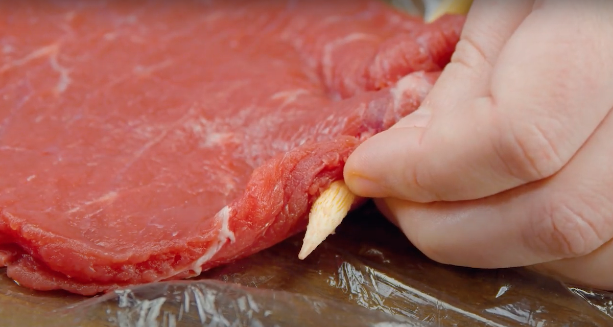 3.1 Lege das Roastbeef zwischen Klarsichtfolie und schlage es mit einem Fleischhammer wieder gleichmäßig platt. Würze wieder mit Salz und Pfeffer und „fädle“ den Spieß erneut auf der linken Seite durch das Fleisch.