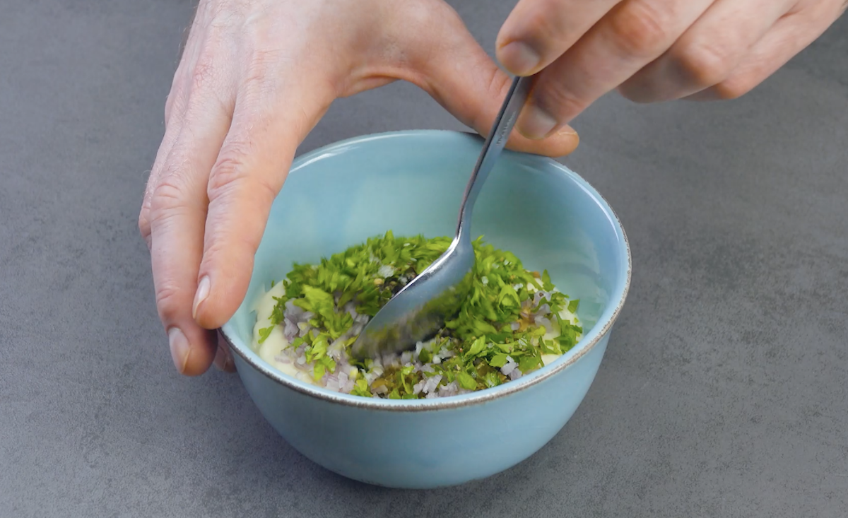 2. Für die Burgersoße gibst du Mayonnaise, Senf, körnigen Senf, Kapern, Schalotte, Sellerieblätter, Salz und Pfeffer in eine Schüssel und vermengst alles miteinander.