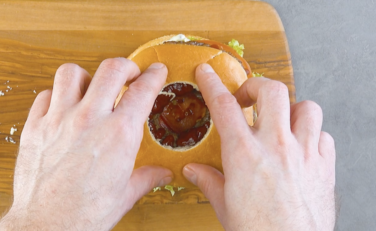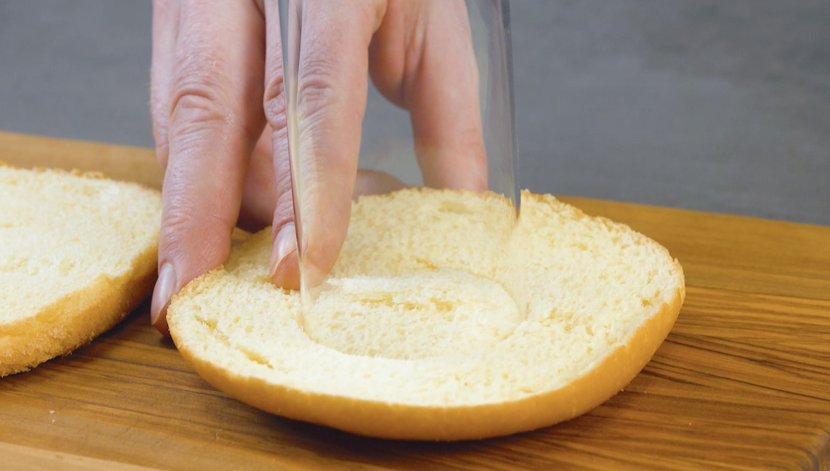 1. Stich zunächst mit einem Glas ein Loch aus der oberen Hälfte des Burger-Buns aus.