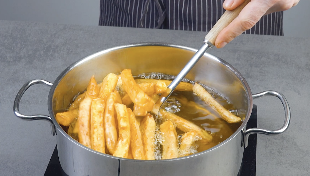 3. Schneide die Kartoffeln in dicke Streifen und wässere sie in kaltem Wasser (wasche so die Stärke heraus). Tupfe sie danach trocken und blanchiere sie für ca. 5 bis 10 Minuten in 140 °C heißem Fett. Lasse sie danach abtropfen und frittiere sie dann nochmals in 160 °C heißem Fett knusprig aus. Würze die Kartoffeln nach dem Frittieren mit Salz.