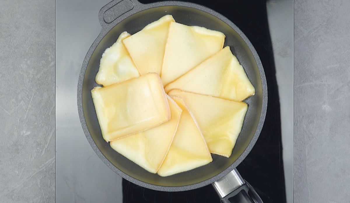 5. Lege den Raclettekäse in eine Pfanne und lass ihn bei kleiner Hitze schmelzen.