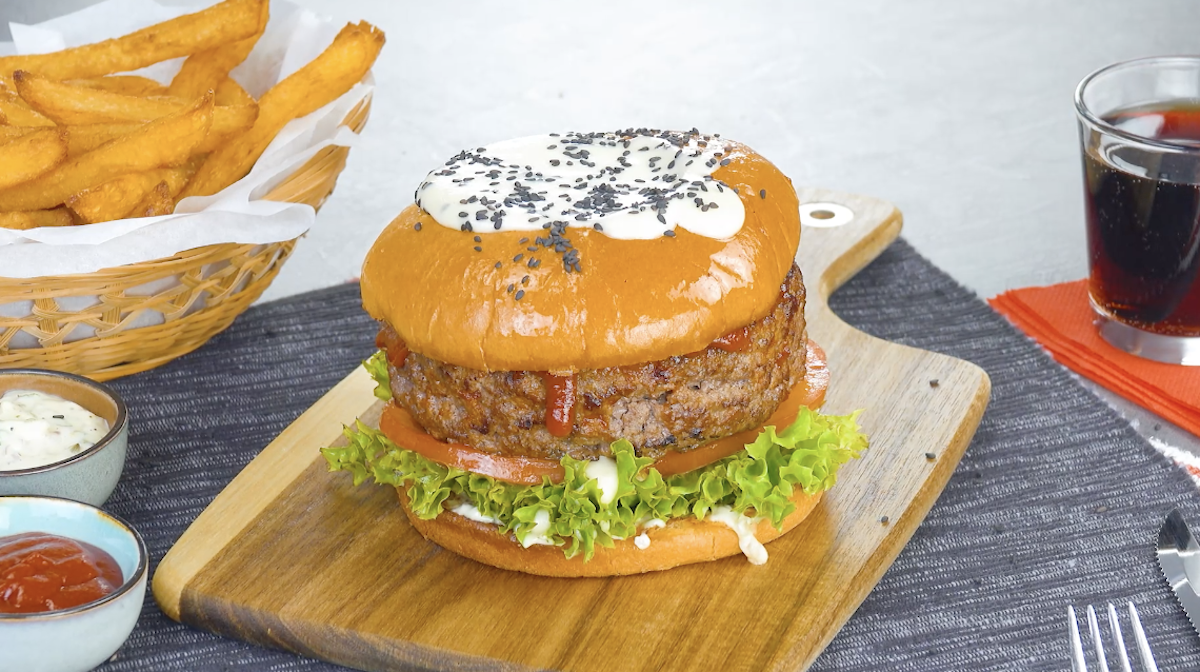6. Bestreiche die untere Hälfte des Burger-Buns mit der selbstgemachten Remoulade, lege ein Salatblatt und Tomatenscheiben darauf. Nun kommen der gebratene Patty-Ring, Ketchup und die obere Hälfte des Burger-Buns mit dem ausgestochenen Loch auf die Tomaten.