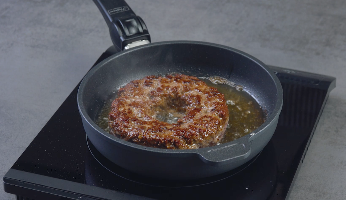 4. Schmecke das Hackfleisch mit Salz und Pfeffer ab. Schäle die große Zwiebel und schneide aus der Mitte einen großen Ring heraus. Ummantle den Zwiebelring komplett und großzügig mit Hackfleisch, sodass ein Hack-Ring entsteht. Brate den Hack-Ring in heißem Öl von beiden Seiten scharf an.