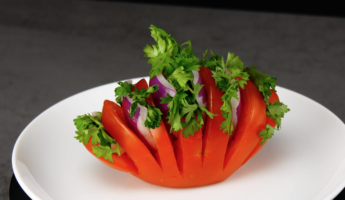 So genanntes „Food Carving“ bezeichnet die künstlerische Bearbeitung von Obst oder Gemüse mit einem Messer. Auf Deutsch also: Obst oder Gemüse schnitzen. In Thailand lernen Kinder Food Carving sogar in der Schule. Das liegt vor allem daran, dass früher diese geschnitzten Kunstwerke die Tische der thailändischen Königsfamilie schmückten. Mittlerweile ist aus dieser alten Tradition eine moderne Kunst geworden. Wir zeigen euch, wie schnell man aus Tomaten kleine Kunstwerke schnitzt.