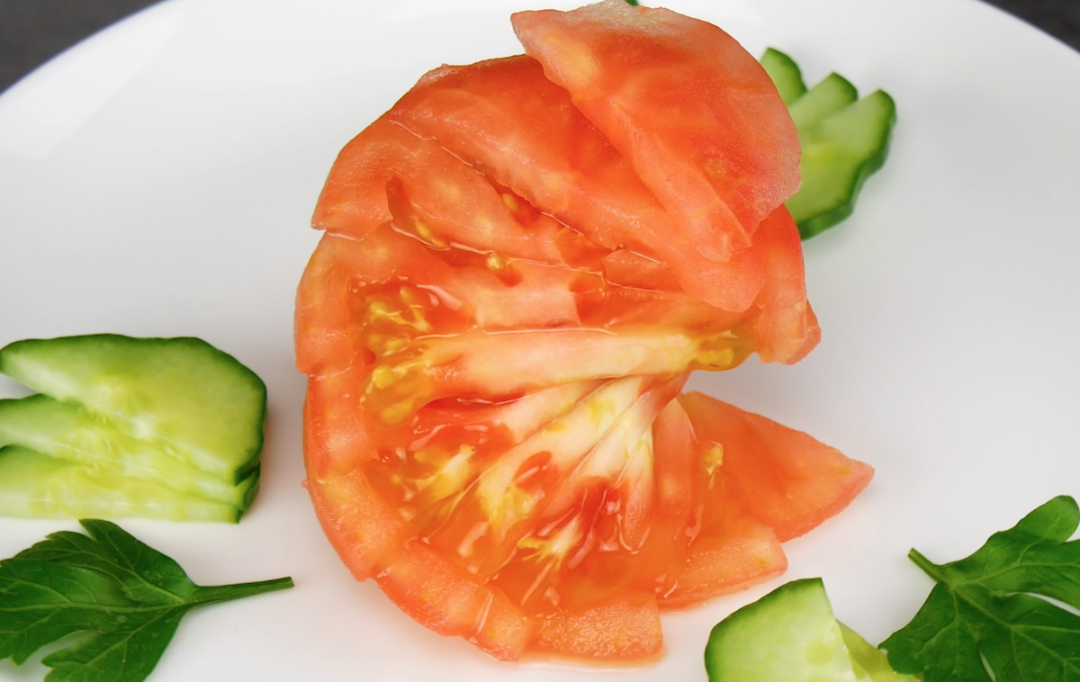 Mit wenigen Handgriffen ist aus 2 Tomaten eine Seerose geschnitzt.