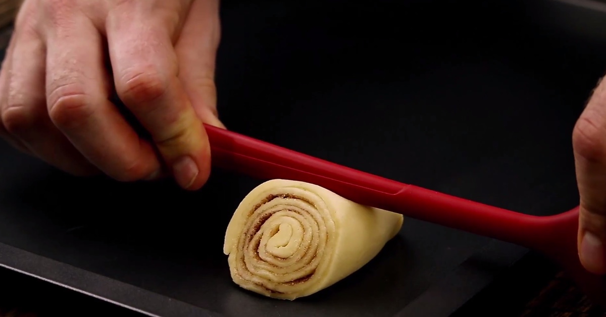 Um die Franzbrötchen in Form zu bringen, schneidest du im wechselnden 45°-Winkel sechs Stücke (Portionen) von der Rolle. Ein fertiges Stück sollte wie ein Trapez aussehen.