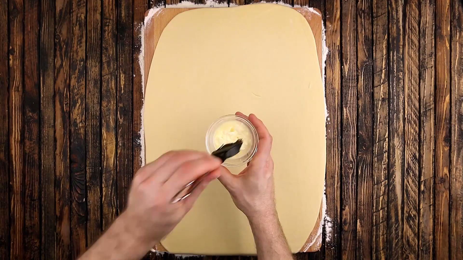 Danach rollst du den Teig auf einer bemehlten Arbeitsfläche zu einem Rechteck aus. Bestreiche ihn mit weicher Butter. Beachte, dass diese nur weich, nicht aber flüssig sein soll.