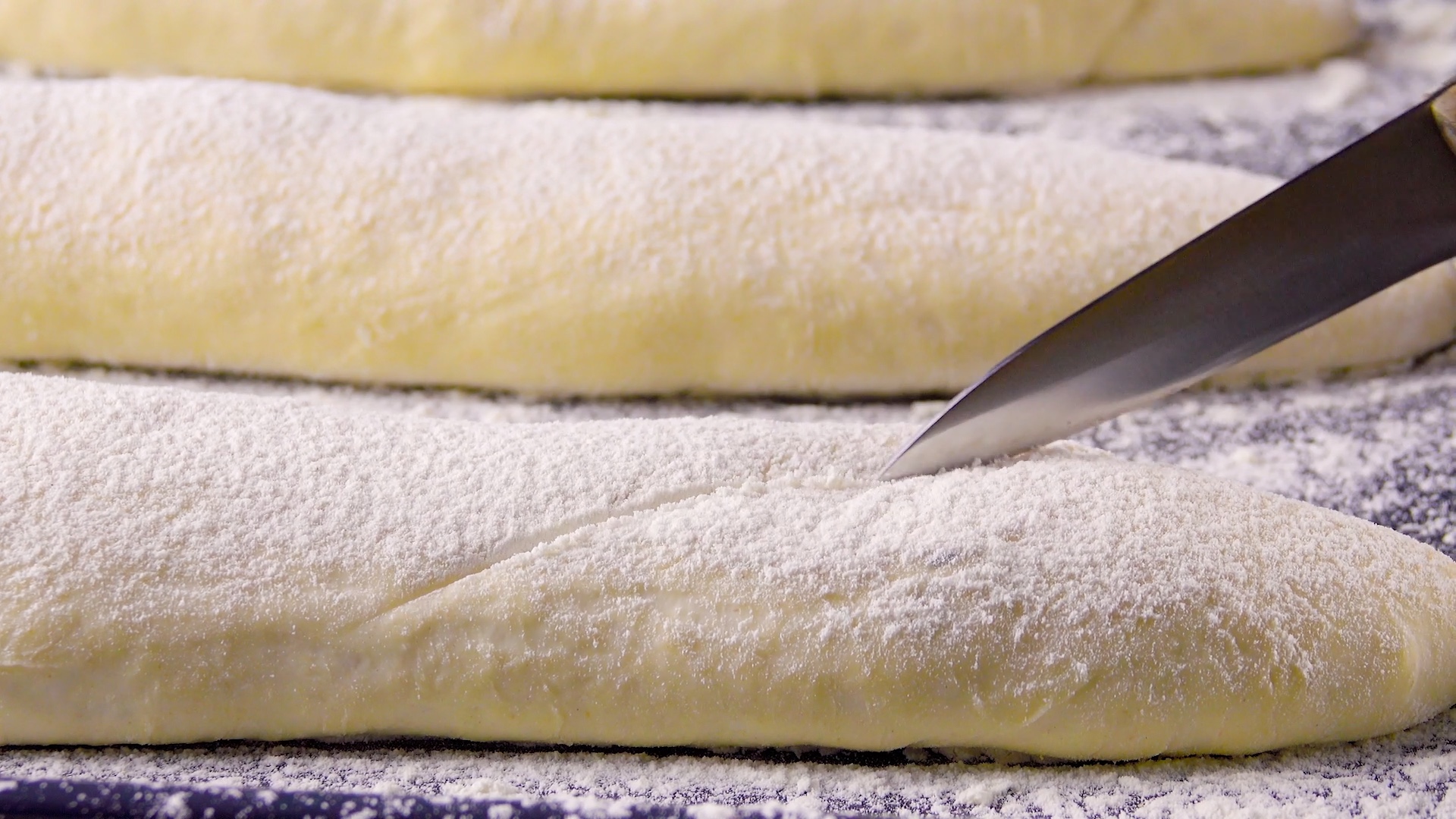 4.) Platziere die Stangen auf einem bemehlten Backblech, bestreue ihre Oberseiten mit Mehl und schneide sie mehrfach ein, damit die Brote beim Backen kontrolliert aufbrechen.