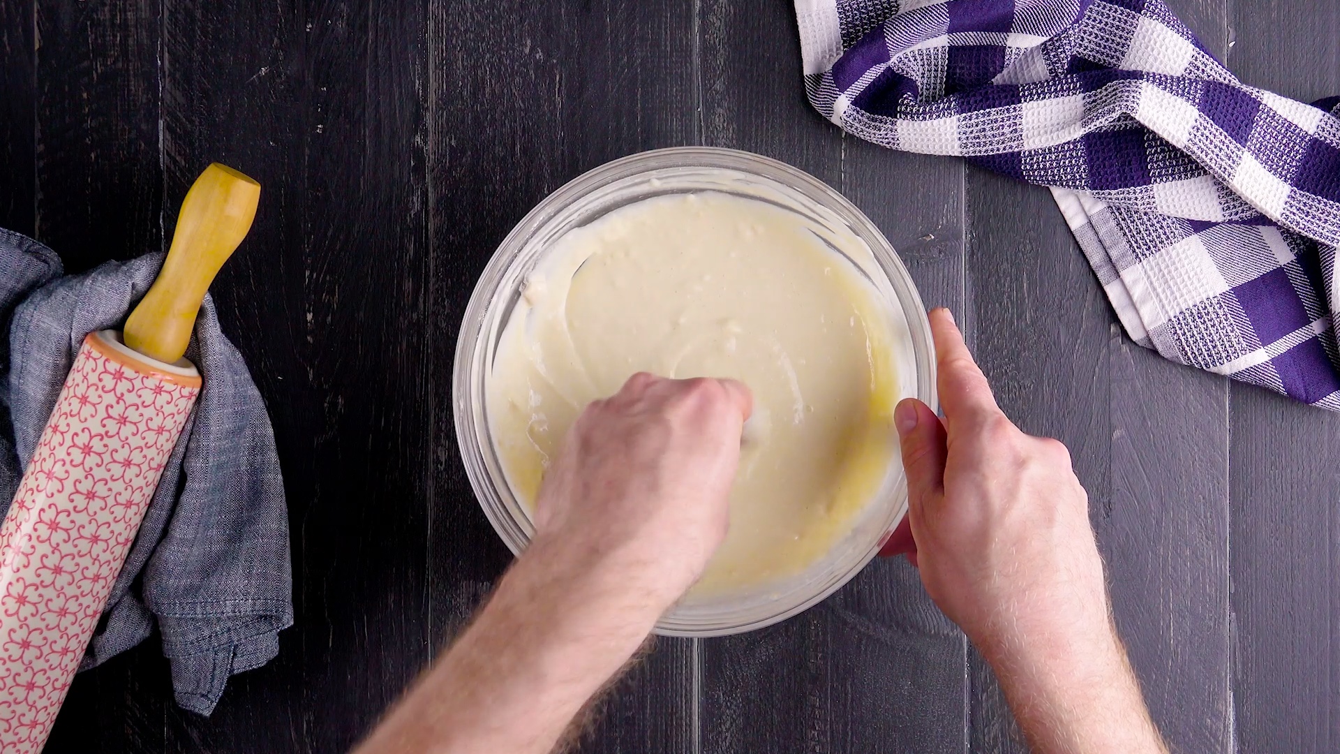 So geht es: 1.) Gib 250 Gramm Mehl, 10 Gramm Hefe und das Wasser in eine große Schüssel. Rühre die Zutaten zu einer Masse, die du mit einem sauberen Tuch abdeckst und vier Stunden gehen lässt.