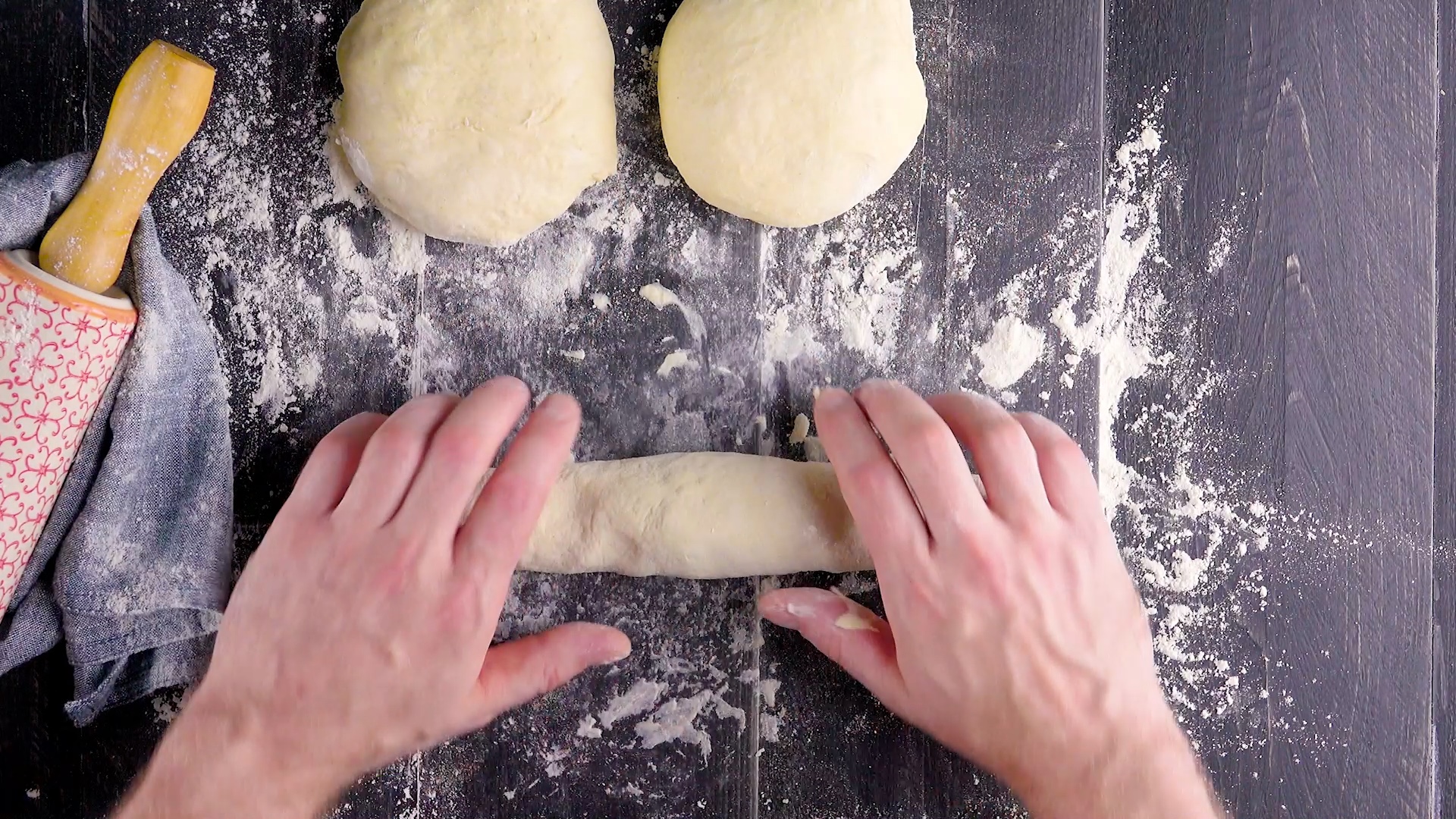 3.) Teile den Teig in drei Portionen gleicher Größe. Rolle jede Portion auf einer gut bemehlten Fläche zu einer Stange.