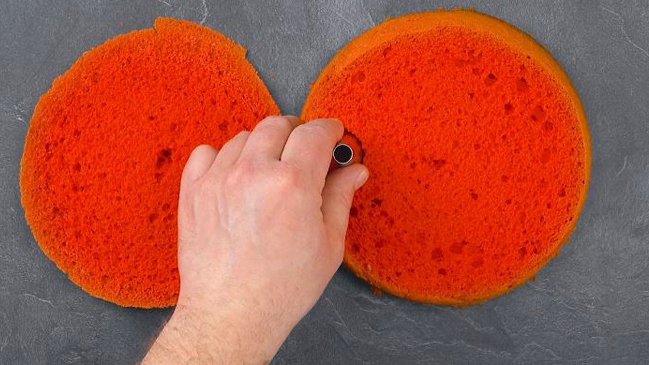 9. Nimm dir danach die Lochtülle eines Spritzbeutels und stich damit kleine Scheiben aus den übrigen Tortenböden aus.