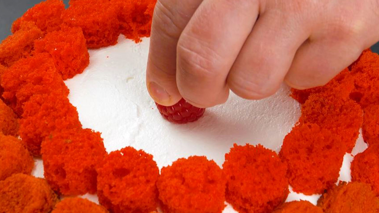 10. Ordne die kleinen Scheiben von unten beginnend rundherum auf dem Himbeerkuchen an. Lass dabei den oberen Teil frei und bedecke ihn mit frischen Himbeeren.