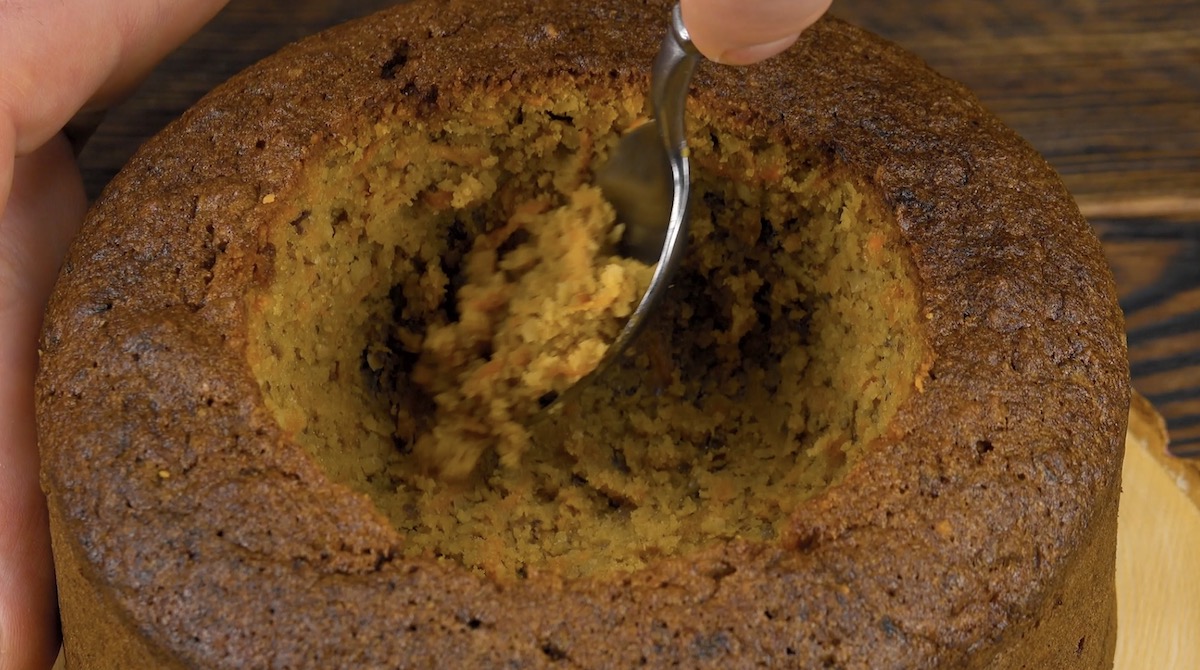 4.) Löse den Kuchen aus der Springform, nachdem er vollständig ausgekühlt ist. Höhle in der Mitte des Kuchens ein etwa drei Zentimeter tiefes Loch aus.