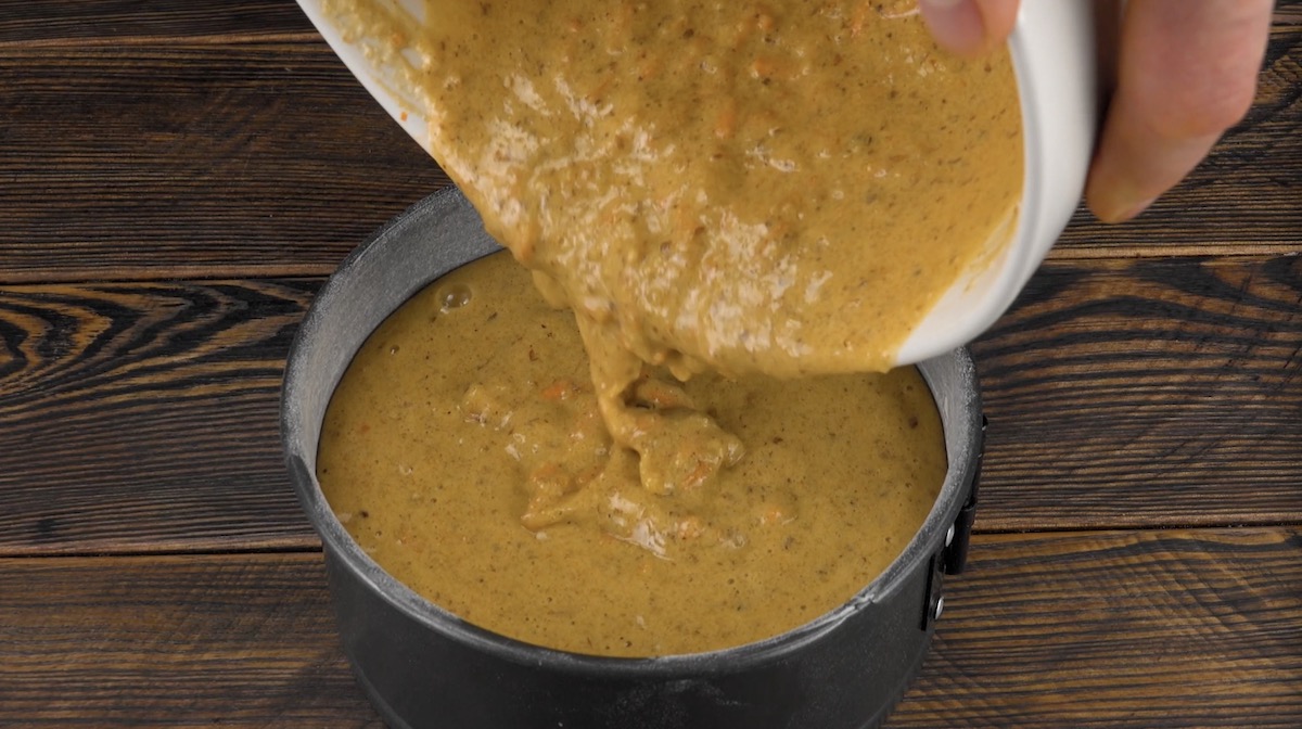 Fülle den Teig anschließend in eine gefettete sowie bemehlte Springform und backe den Kuchen für 50 Minuten bei 175 °C im Umluft-Modus.