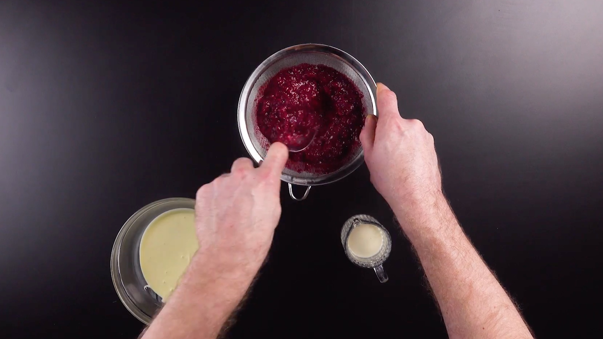 6.) Koche die Brombeeren ein und streiche sie durch ein Sieb. Rühre sowohl die Sahne als auch die flüssige Schokolade unter das Brombeerpüree und stelle es 30 Minuten kalt. Danach schlage es zu einer luftigen Creme mit dem Handrührgerät auf.