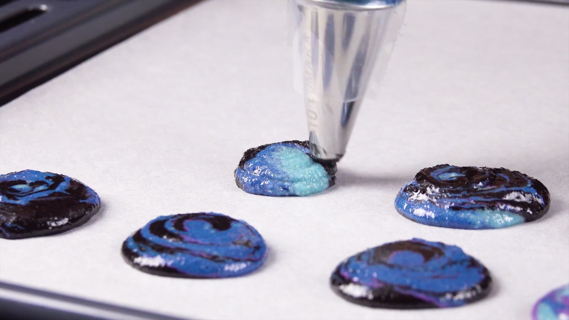 4.) Setze mit dem Spritzbeutel kleine Macarons auf ein mit Backpapier ausgelegtes Blech. Drehe dabei den Spritzbeutel jeweils in einer Spiralbewegung. Bei 150 °C Ober- und Unterhitze backst du die Macarons für 13 Minuten.