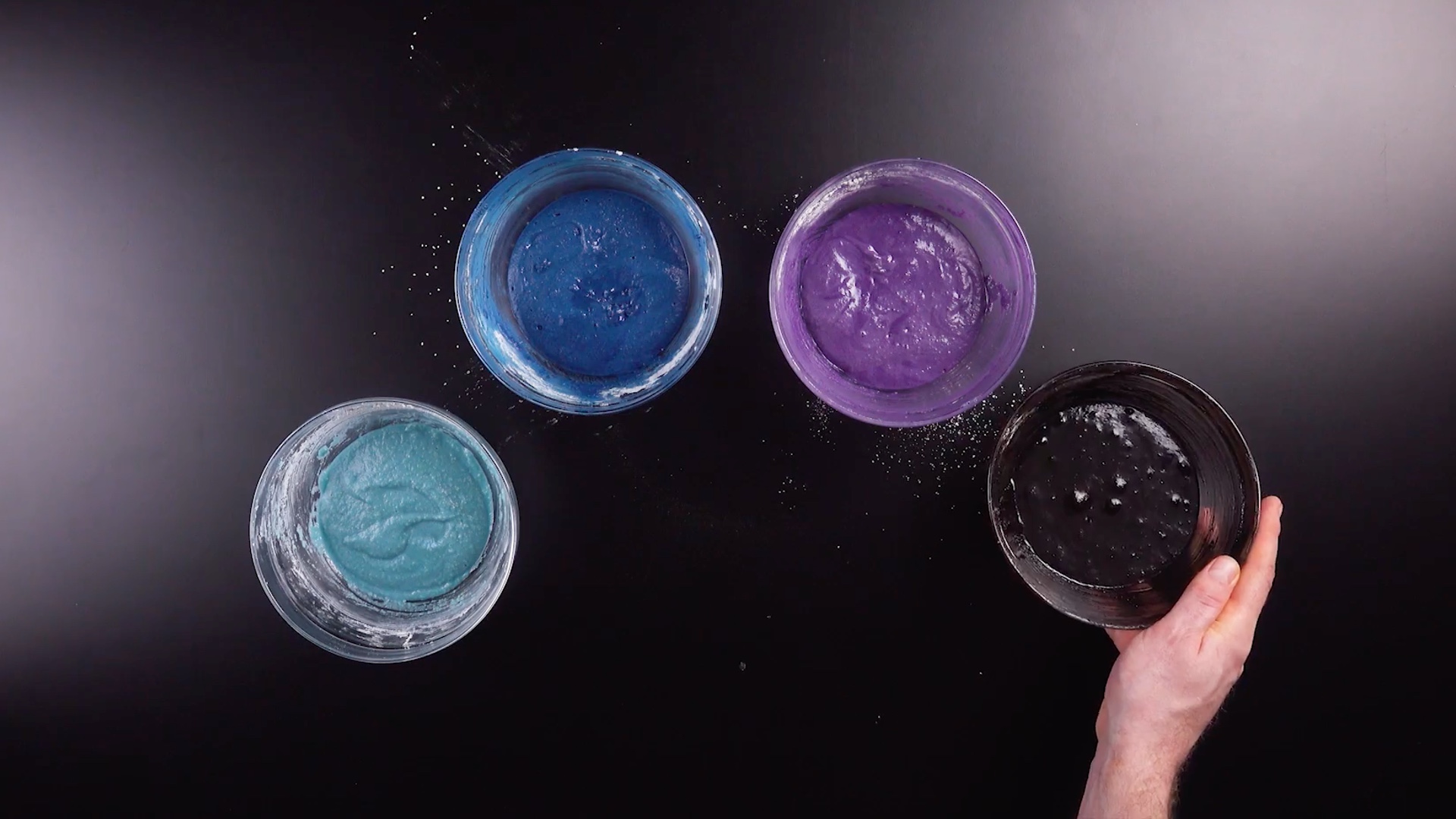 - Lebensmittelfarben in Blau, Lila, Schwarz und Weiß