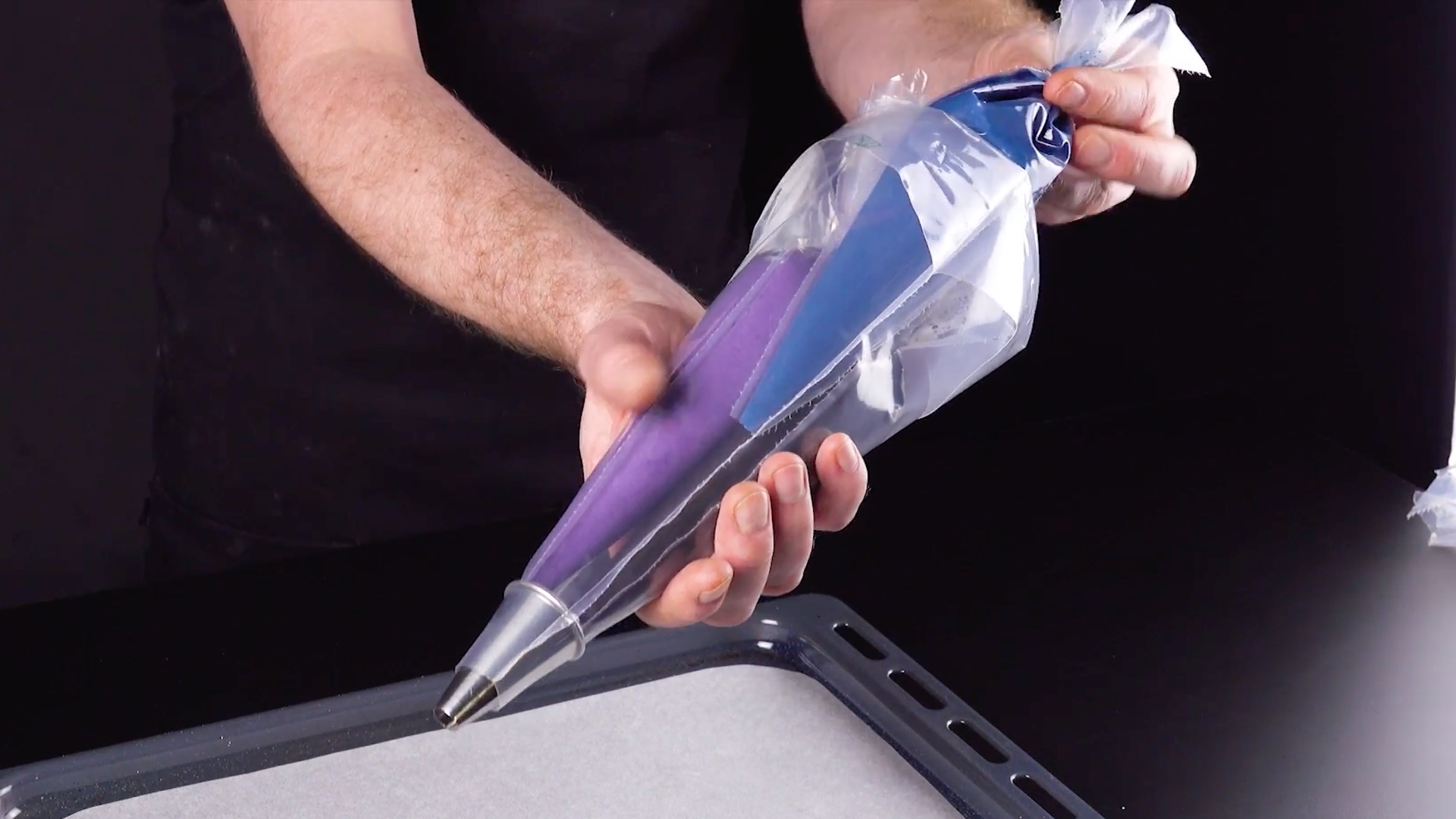 3.) Fülle jeden Teig in einzelne kleine Spritzbeutel ohne Tülle. Schneide die Spitzen ab und lege die kleinen Spritzbeutel gemeinsam in einen großen Spritzbeutel mit Tülle.