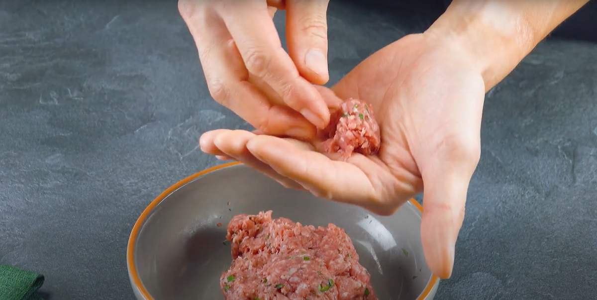 4. Vermische die Zutaten gut miteinander und forme dann die Fleischbällchen. Diese sollten etwa die Größe der aus den Kartoffeln ausgestochenen Mulden haben, damit sie dort gut hineinpassen.