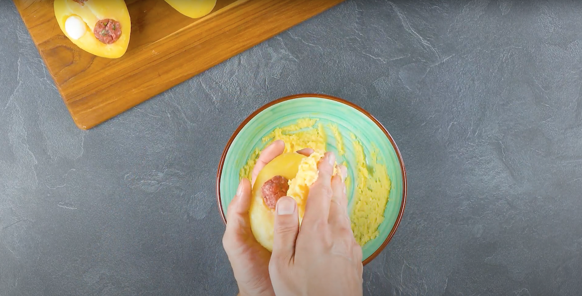 9. Drücke die Kartoffelpüree-Masse von allen Seiten fest an die gefüllte Kartoffel, sodass sie vollständig ummantelt ist.