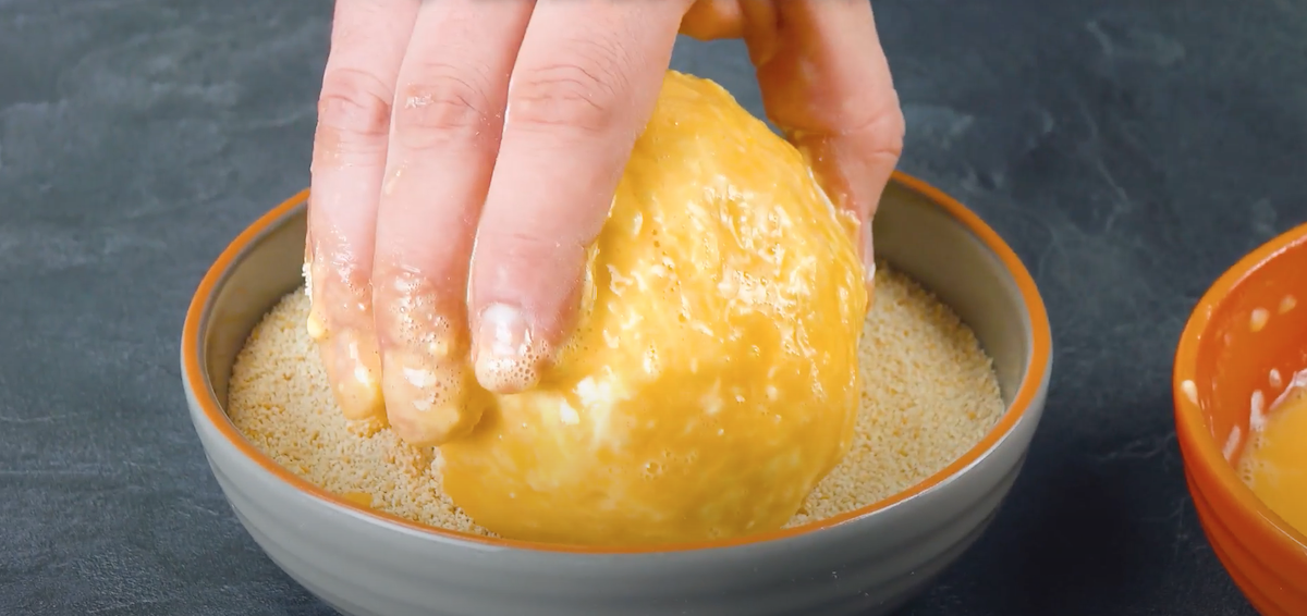 11. Paniere die gefrorene Kartoffel. Wälze sie dazu zuerst in Mehl, dann in einem verquirlten Ei und zuletzt in Semmelbröseln.
