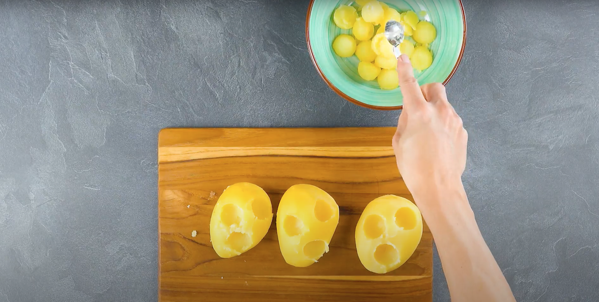 So geht es: 1. Koche die Kartoffeln und lass sie abkühlen. Sobald die Kartoffeln abgekühlt sind, stich mit einem Pariser Löffel 6 Mulden aus ihnen aus – jeweils 3 auf einer Seite.