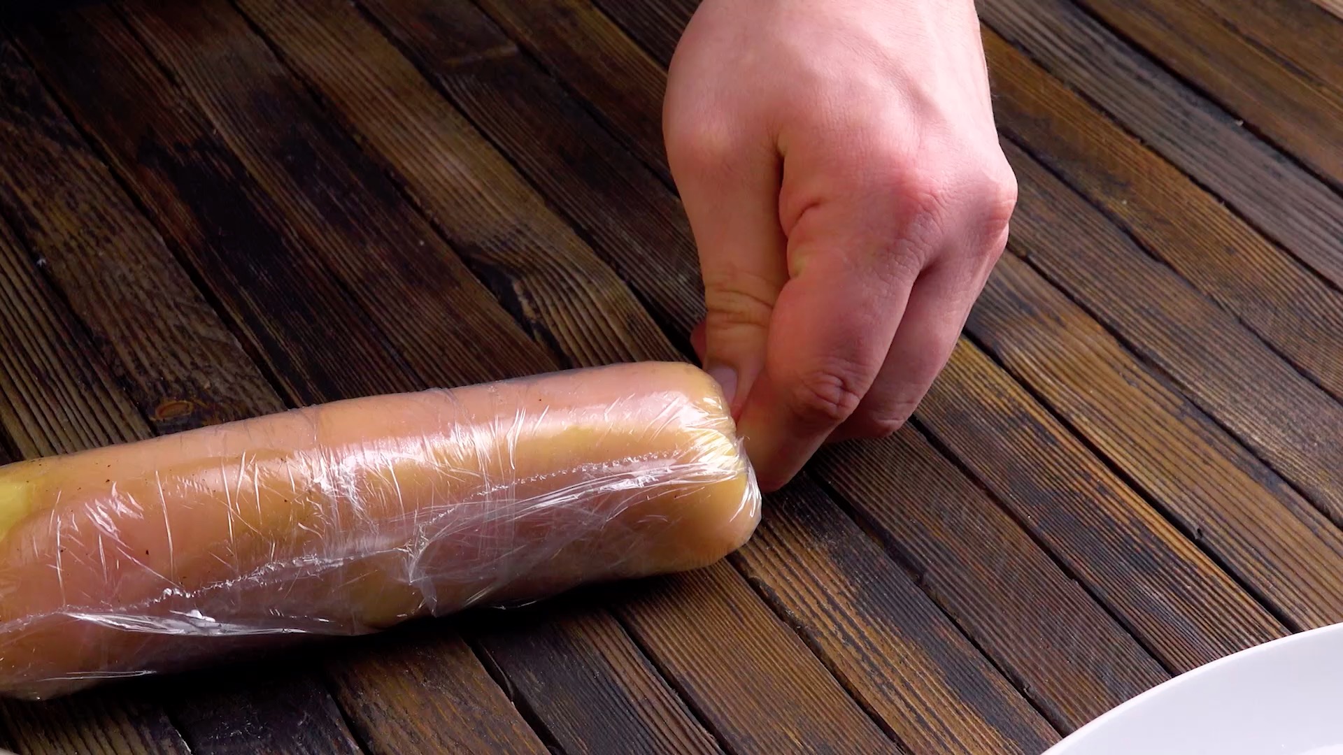 2.) Rolle die belegte Hähnchenbrust eng ein und wickle sie in Frischhaltefolie, die du an beiden Seiten gut zuzwirbelst. Kühle die Rouladen eine Stunde lang.