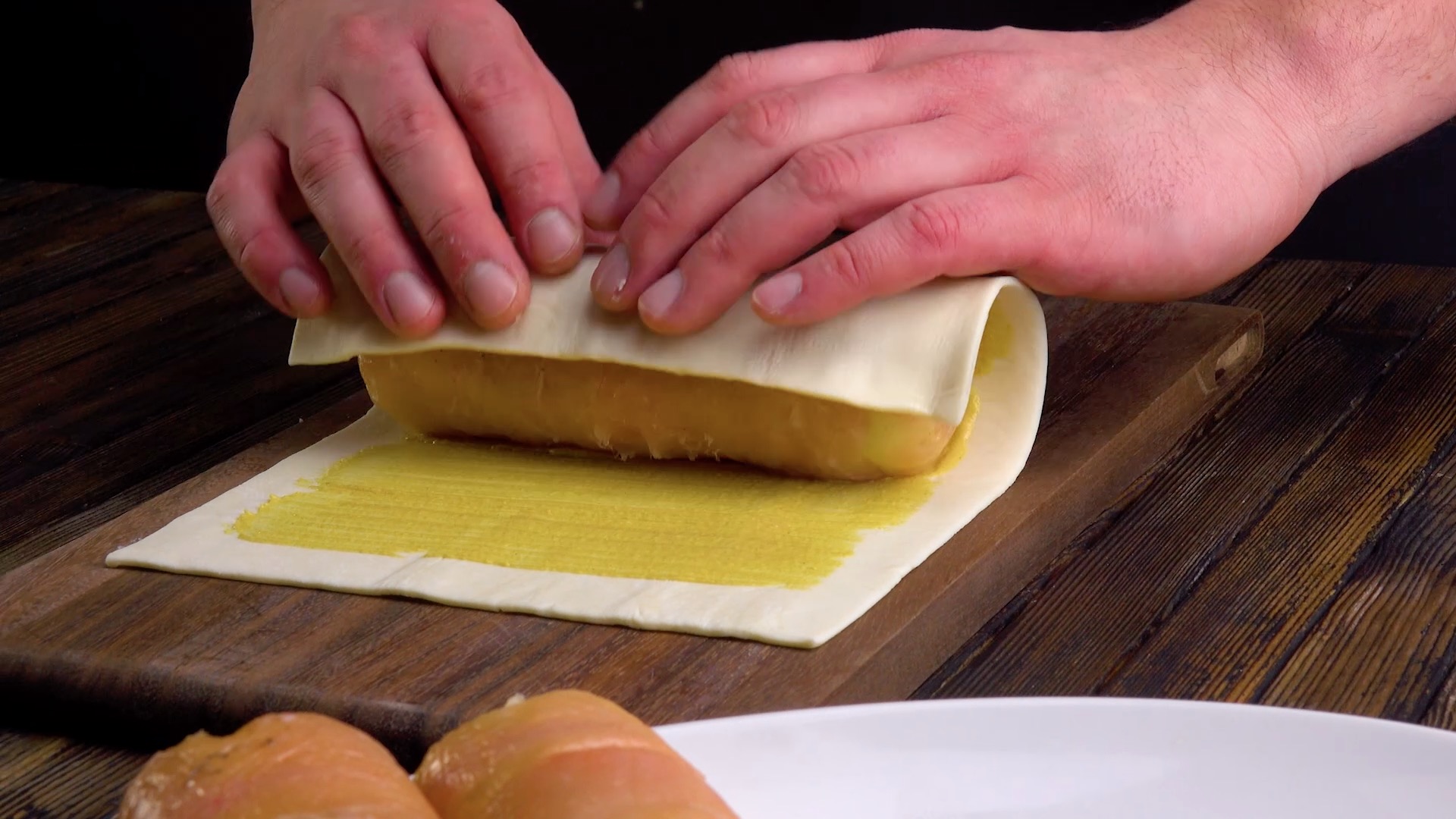 3.) Rolle den Blätterteig aus, halbiere ihn und bestreiche jede Hälfte mit Senf. Lege die Roulade auf die Mitte und wickle sie mit dem Blätterteig zu einer schönen Rolle.