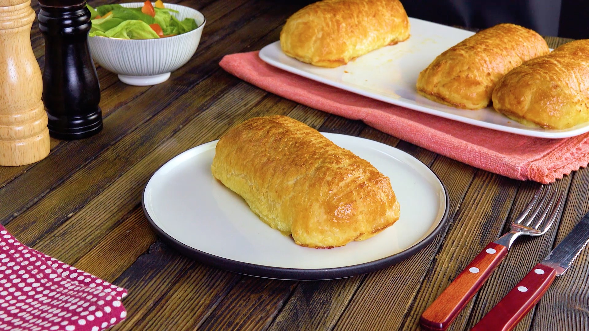4.) Bestreiche die Rollen mit den beiden verquirlten Eiern und ritze mit einer Gabel ein Kreuzmuster in den Blätterteig. Gare die Rollen 30 Minuten lang bei 170 °C Umluft im Ofen.