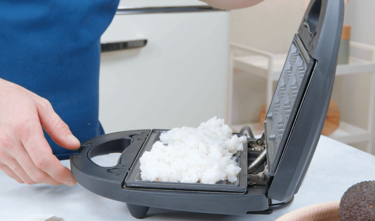 6. Öle das Waffeleisen ein und verteile den Reis auf dem Eisen. Backe den Reis, bis er goldbraun ist.