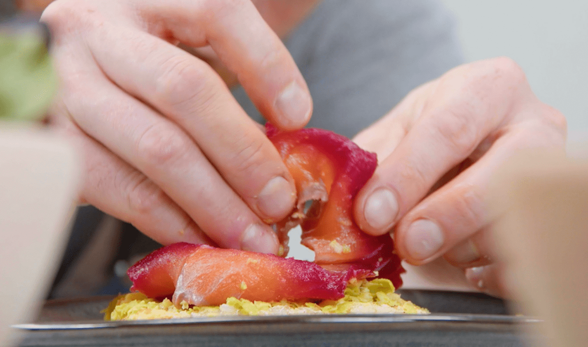 7. Lege die Reiswaffel auf einen Teller und reibe die gefrorene Avocado darüber. Schneide außerdem den gebeizten Lachs in Scheiben und drapiere einige von ihnen auf der Reiswaffel.