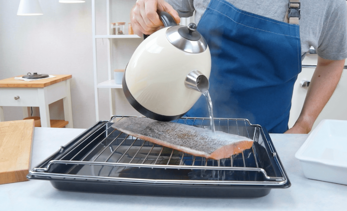 2. Lege anschließend den Lachs auf einen Gitterrost und gieße heißes Wasser über den Fisch. Danach kannst du dessen Haut problemlos abziehen.