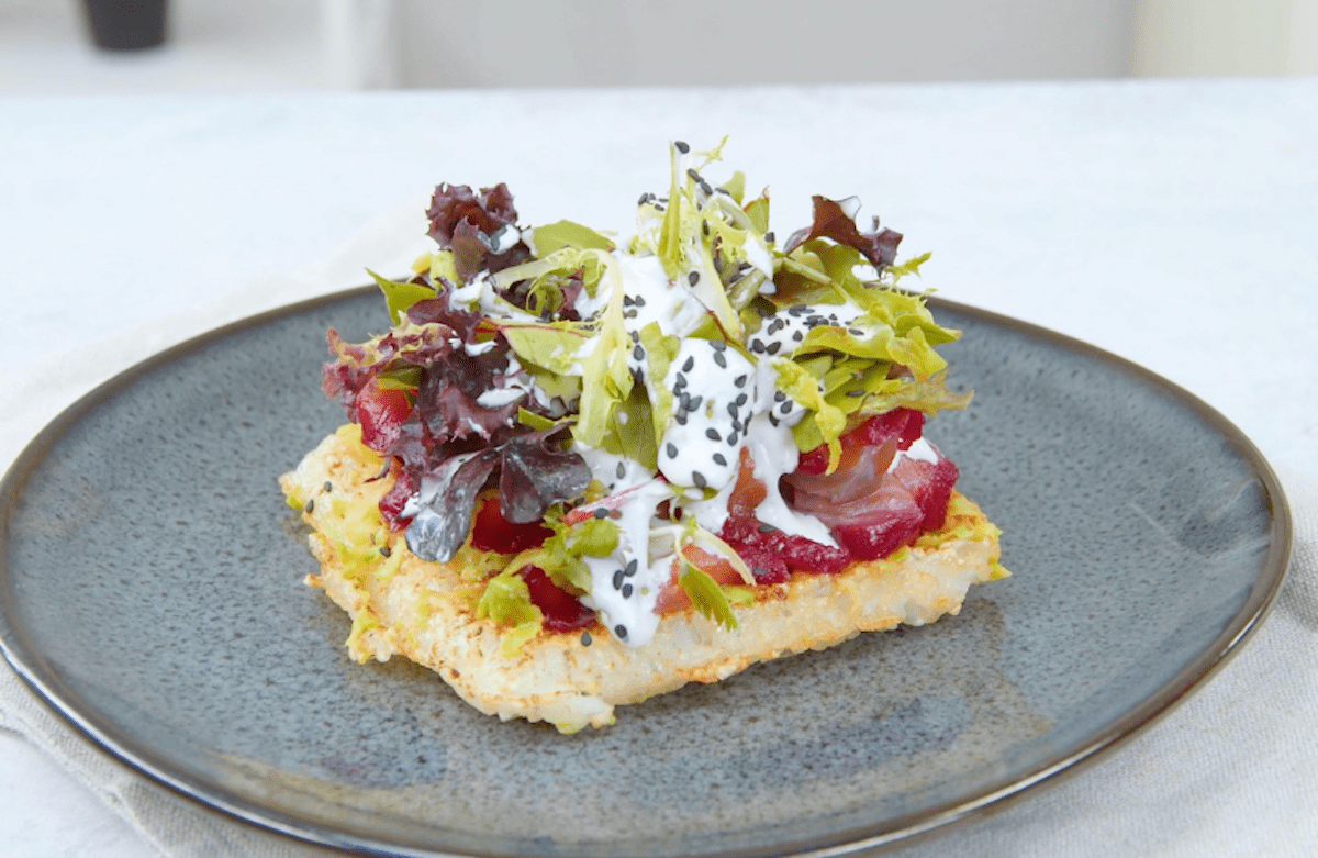 Hast du Lachs schon mal selbst gebeizt? Das ist überhaupt nicht schwer! In diesem Rezept verpassen wir dem Lachs sogar noch einen kleinen Farbtupfer. Serviert wird dieser köstliche Fisch auf einer gebackenen Reiswaffel mit Avocado, Salat und Joghurtsauce – ein köstlicher Genuss, nicht nur im Sommer.