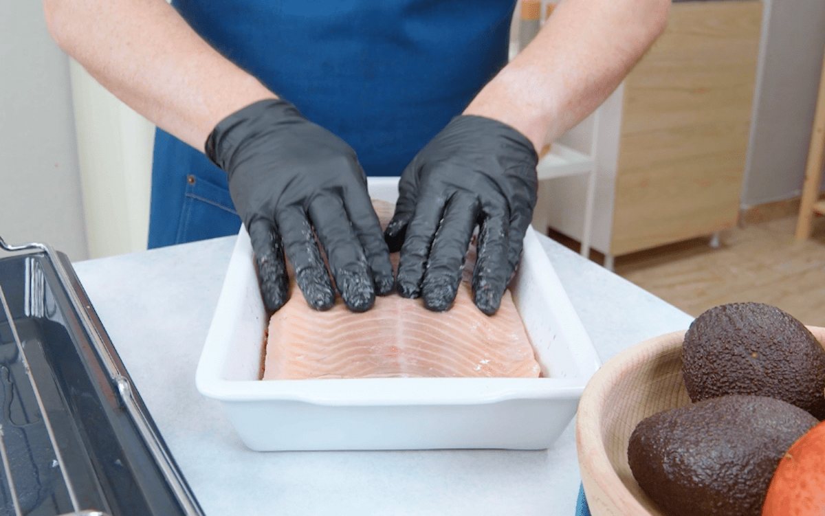 3. Lege den Lachs nun in die Beize und decke die Form mit Frischhaltefolie ab. Lass den Fisch für mindestens 24 Stunden im Kühlschrank ziehen.