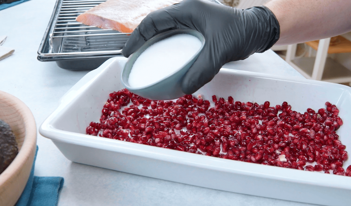 1. Da der Fisch 24 Stunden ziehen muss, bereitest du ihn am besten bereits am Vortag zu. Ziehe Handschuhe an und klopfe zunächst die Granatapfelkerne z.B. mit einem Holzlöffel in eine längliche Auflaufform. Gib außerdem Salz und Zucker mit in die Form und vermenge alles miteinander.