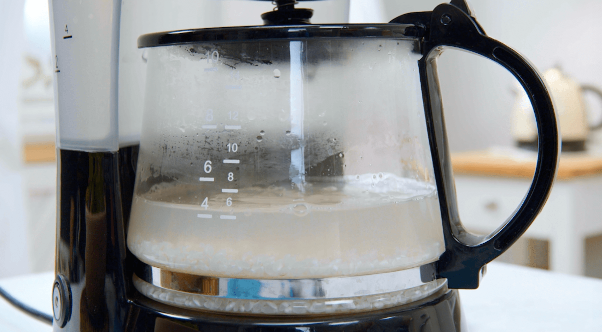 5. Koche den Reis mit Salz, Zucker, Ingwer, Knoblauch, Rosmarin und Chili. Wir haben den Reis in der Kaffeemaschine gekocht – das klappt wirklich! Du kannst den Reis aber natürlich auch „klassisch“ im Topf kochen.