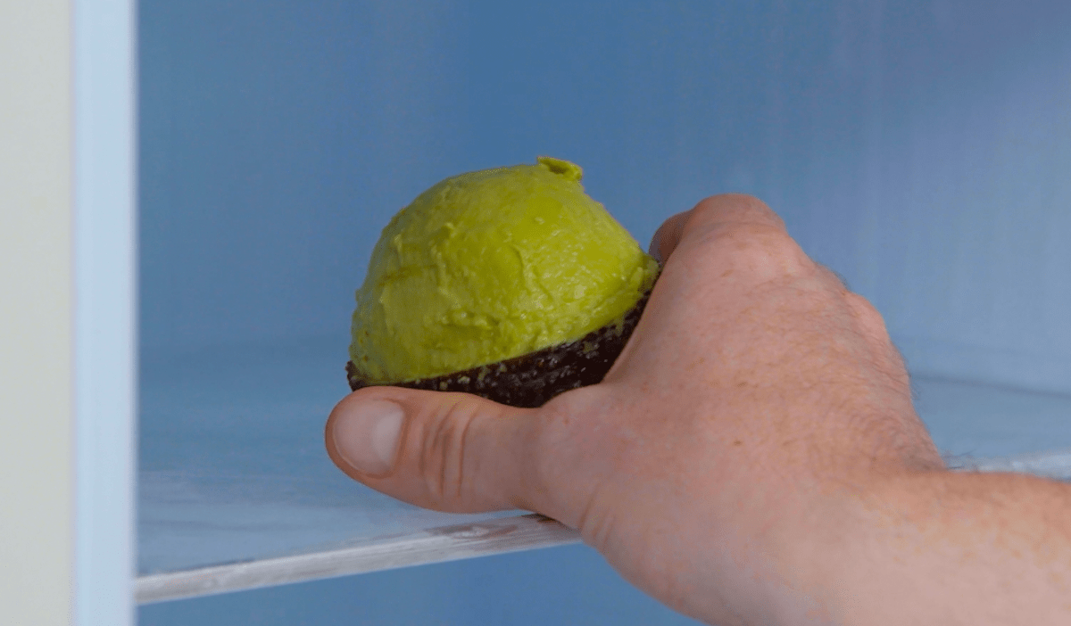 4. Schäle am Folgetag die Avocado zur Hälfte und friere die Frucht für eine Stunde ein.