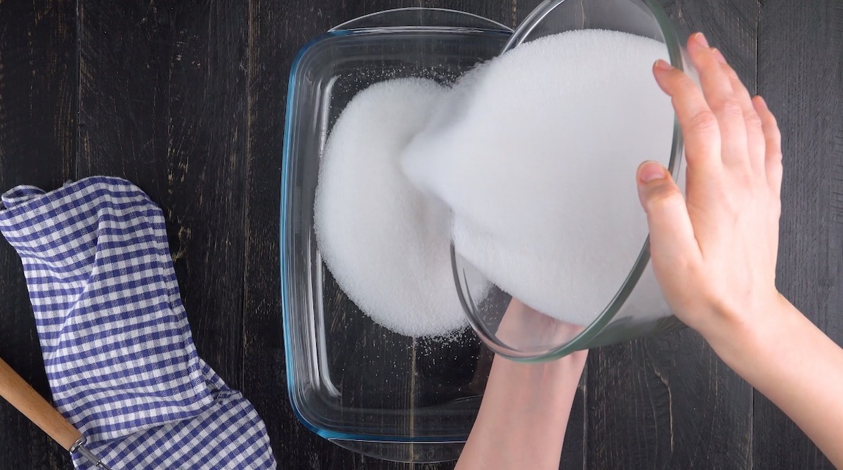 So geht es: 1.) Vermische das Salz mit dem Zucker und gib 2/3 dieses Gemischs in eine große Auflaufform.