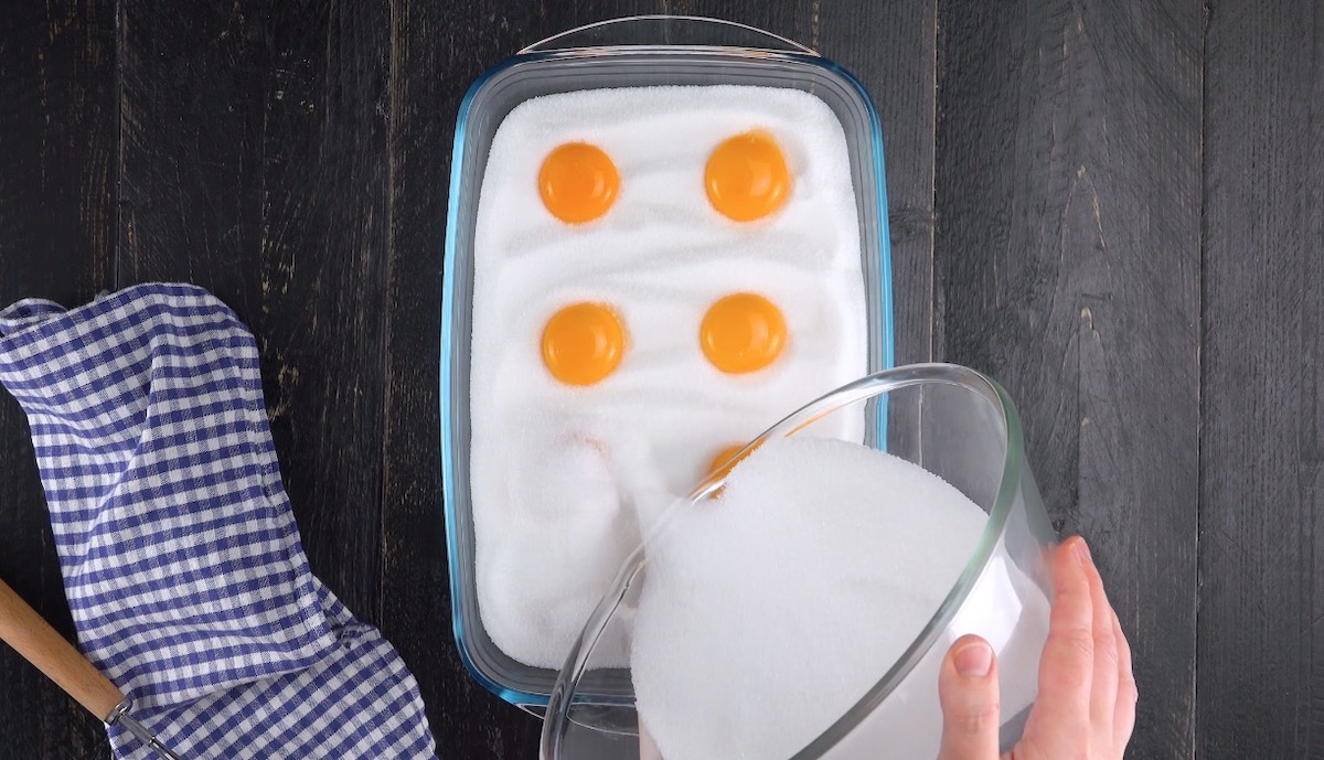 2.) Drücke mit einem Ei 8 kleine Kuhlen in die Mischung und lege dort 8 Eigelbe hinein. Den Rest der Salz-Zucker-Mischung verteilst du nun auf den Eigelben. Stelle die Form mindestens 3 bis 4 Tage kalt.
