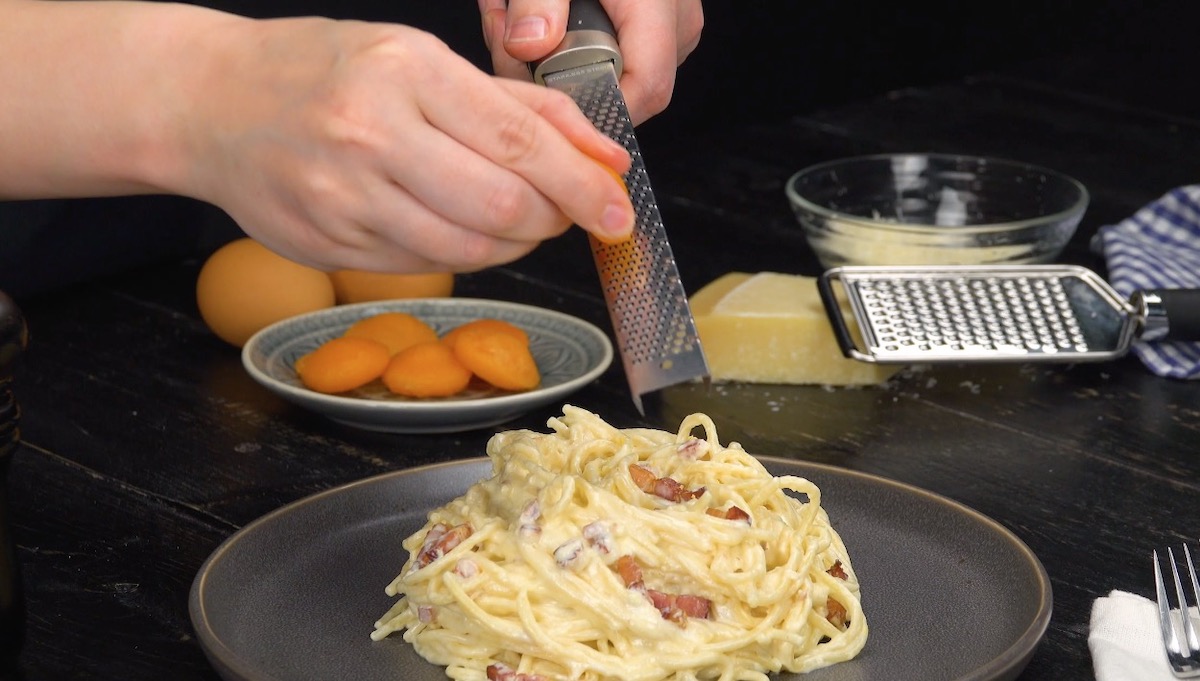 4.) In unserem Fall benutzen wir das gebeizte Eigelb als würziges Extra für Nudeln mit Speck-Sahne-Sauce. Brate dafür den Speck in einer Pfanne mit klein geschnittener Zwiebel und klein geschnittenem Knoblauch an. Gib Sahne hinzu und lasse alles etwas köcheln. Füge geriebenen Parmesan und gekochte Spaghetti hinzu – fertig ist das leckere Pasta-Gericht. Am Schluss reibst du das gebeizte Eigelb als Topping über die Pasta. Du wirst merken, wie gut es in Verbindung mit dem Rest schmeckt.