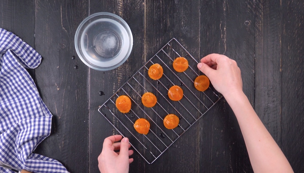 3.) Hole die Eigelbe dann aus der Auflaufform heraus und wasche sie kurz mit Wasser ab. Lege sie auf ein Gitter und lasse sie im Ofen bei 65 °C für 30 bis 35 Minuten trocknen.