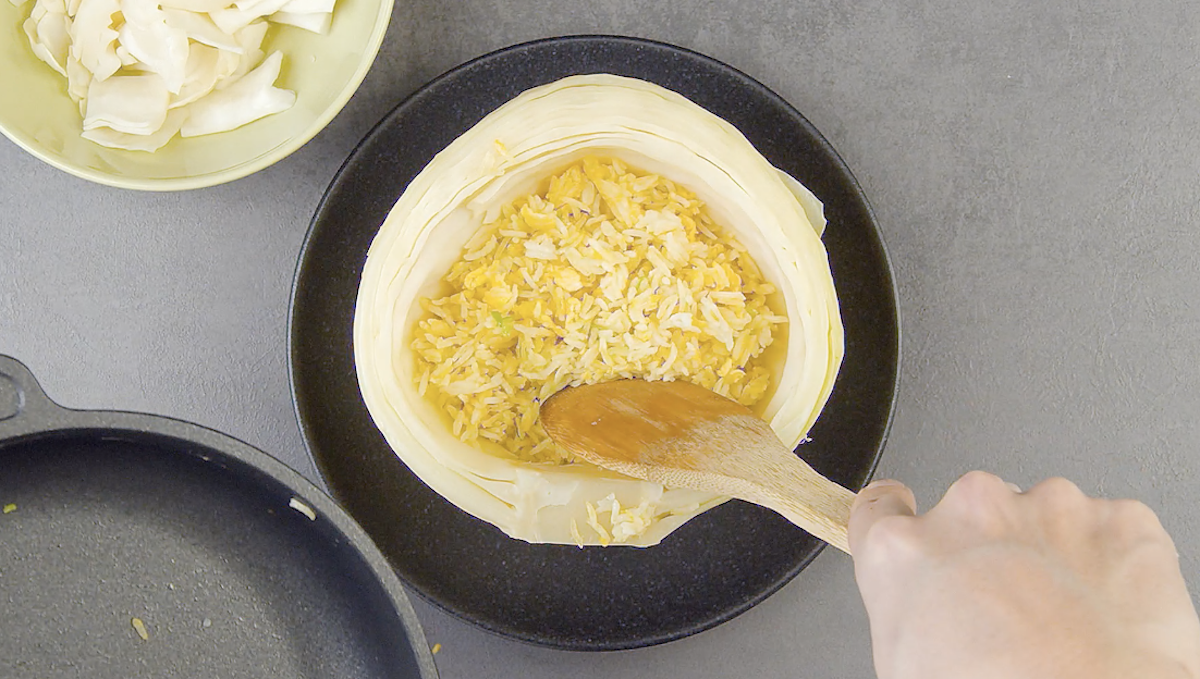 Würzig gefüllter Kohl für die schnelle Küche. Gebratener Reis mit Ei und Schweinebauch mit Miso, serviert in einem gedämpften Weißkohl. Da kann man sich gleich den Teller sparen.
