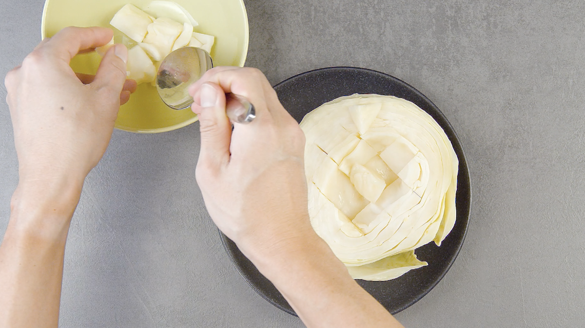 2. Schneide den gedämpften Weißkohl ein und nimm das Innere heraus, gib es in eine Schüssel und stelle diese kurz beiseite.