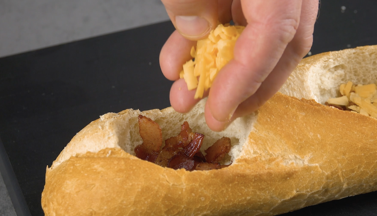 1.2) Brate Bacon in einer Pfanne an, schneide ihn klein und verteile ihn gleichmäßig in den Baguette-Mulden.