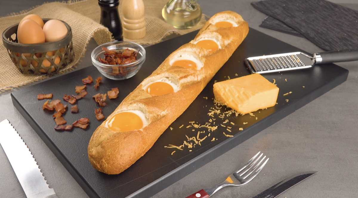 1.4) Schlage nun noch in jedes Loch ein Ei. Backe das Baguette schließlich für 15 Minuten bei 175 °C Umluft. Fertig!