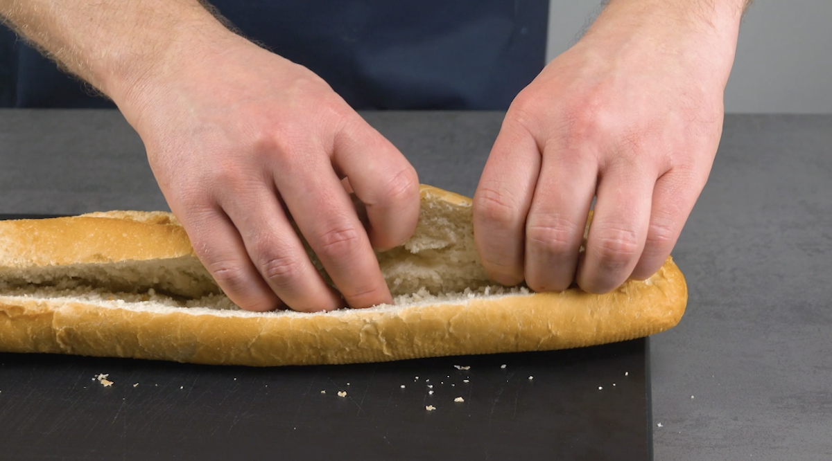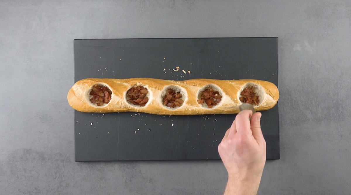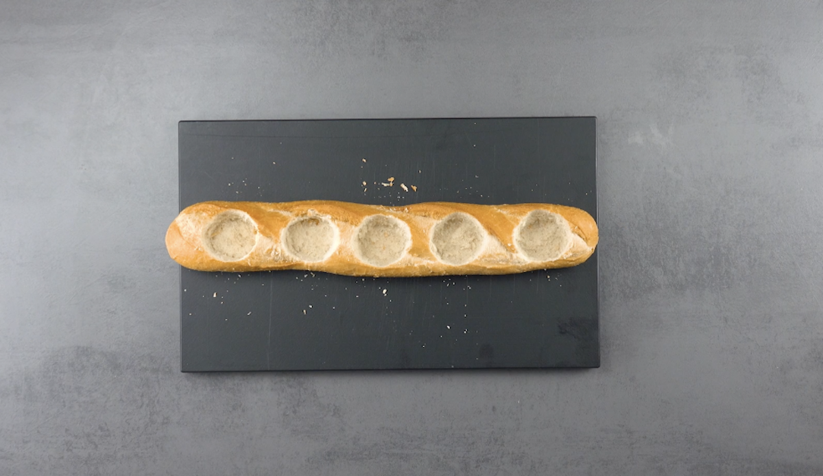1.1) Schneide in ein Baguette mit einem Messer 5 gleich große, kreisförmige Löcher und hole das Innere heraus.