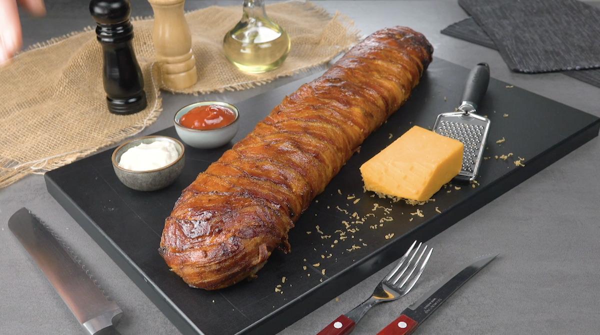 2.3) Lege die Baconscheiben in 2 Reihen längs nebeneinander und platziere das Baguette in der Mitte. Wickle das Baguette mit den Scheiben ein und gib es abschließend bei 170 °C Umluft für 45 Minuten in den Ofen.