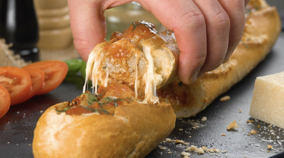3.2) Schneide ein langes Rechteck aus dem Baguette heraus. Fülle das Baguette dann mit geriebenem Mozzarella, Parmesan und den Fleischbällchen mit der Tomatensauce. Verteile dann noch einmal geriebenen Mozzarella auf der Tomatensauce. Schiebe das Baguette bei 175 °C Umluft für 25 Minuten in den Ofen. Bestreue das fertige Baguette noch mit frischem, klein gehacktem Basilikum.