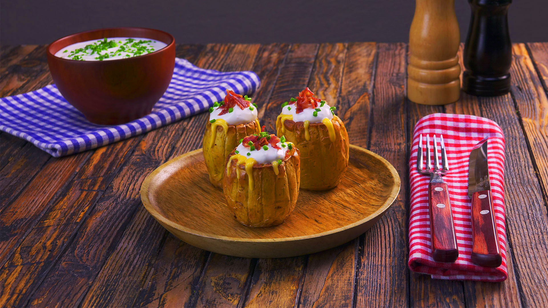 Schließlich garnierst du sie mit einem großen Klecks Sour Cream, weiterem Bacon und Schnittlauch.