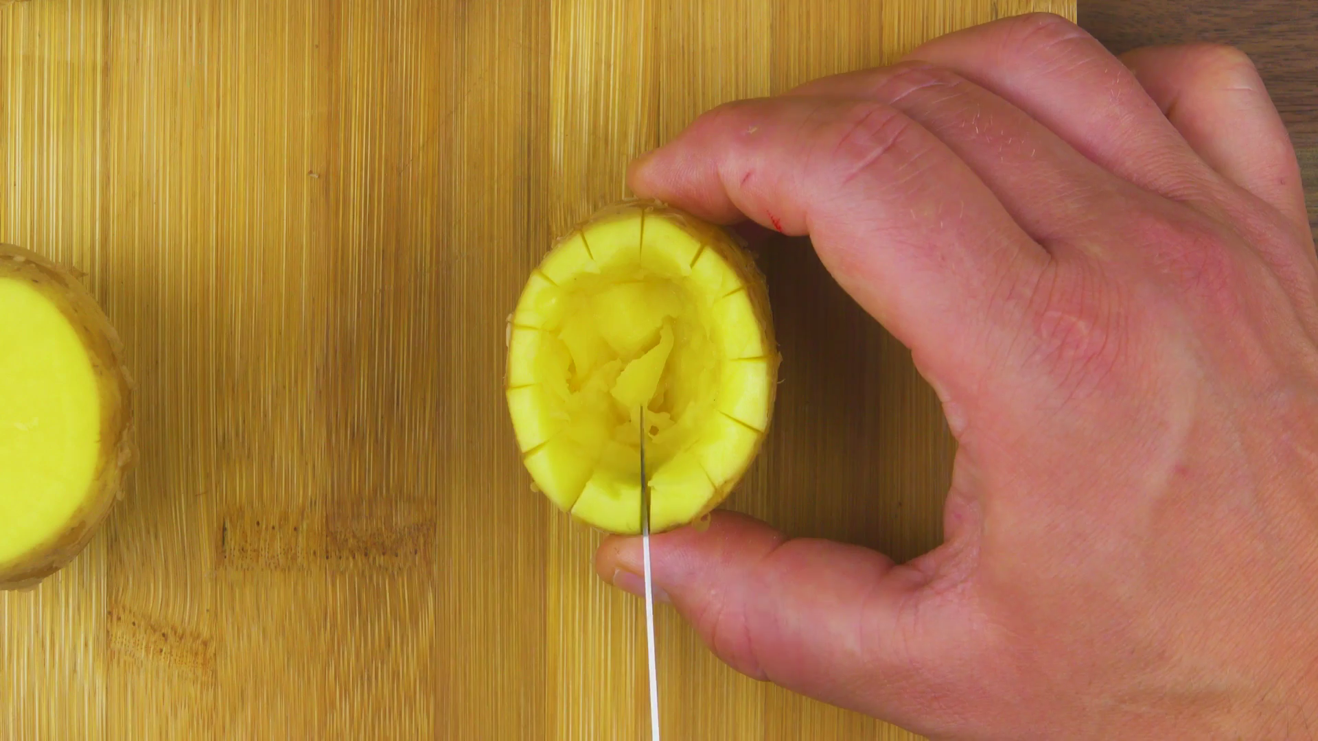 Schneide von den beiden Enden der Kartoffeln ein kleines Stückchen ab, sodass eine Standfläche entsteht. Mit einem Messer schneidest du dann einen kleinen Kegel aus jeder Kartoffel, dessen Ränder du längs einschneidest.